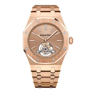 Корпус: Сложной конструкции, состоящей из трех частей: Сатинированная сталь AISI 904L, покрытая розовым золотом методом PVD.; Циферблат: Позолоченный, гильошированный (Mega Tapisserie). Часовые риски и стрелки Royal Oak, покрытые люминесцентным составом Super LumiNova С3. Декорированная, ось одноминутного парящего турбийона, расположенного в отметке на 18.00 часов.; Безель: Фиксированный в одном положении 8 многогранными винтами, позолоченный сатинированный безель грубой шлифовки.; Задняя крышка: С сапфировым стеклом на 8 винтах и гравировкой по радиусу сатинированного кольца с указанием серийного номера, номера серии и маркировки.; |