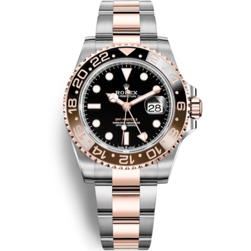 Корпус: Сатинированная, полированная сталь AISI 904L, частично покрытая розовым золотом методом PVD.; Циферблат: Чёрный. Позолоченные часовые риски и стрелки, покрытые люминесцентным составом Super LumiNova С3, зеленого свечения. Окно даты в отметке на 15.00 часов под увеличительным окном 2,5. Гравировка маркировки Rolex и серийного номера Rolex на внутреннем ранте.; Безель: Двунаправленный, вращающийся коричнево-чёрный керамический безель, с часовыми метками времени GMT (при вращении безеля 24 щелчка).; Задняя крышка: Выпуклая завинчивающаяся задняя крышка из сатинированной стали. Гравировка маркировки Rolex с внутренней стороны крышки.; |